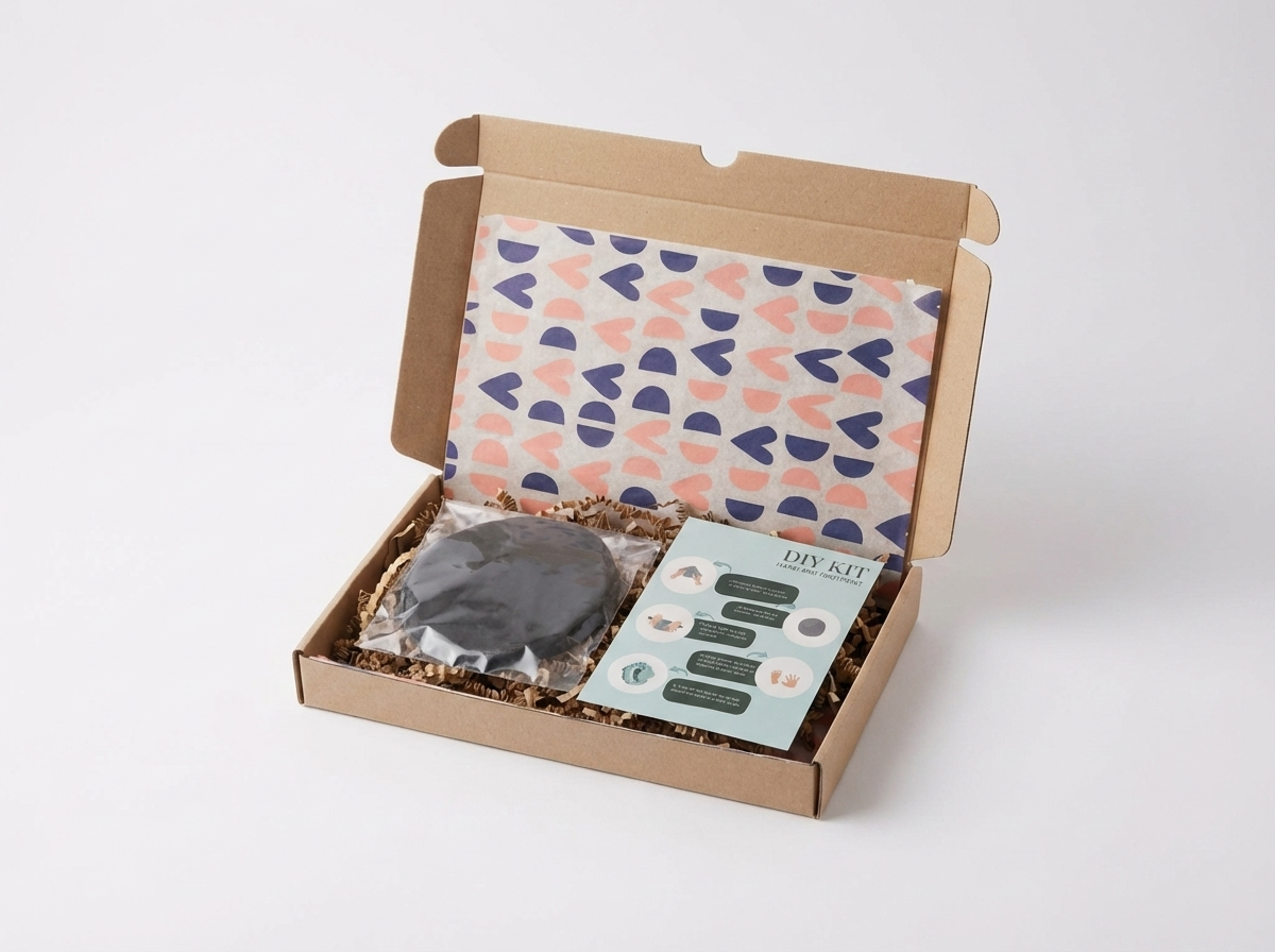 Mailbox size kit with a short how-to description and foam for one hand- or footprint. Foam is shipped in ziplock and can be send back to you by your client in the same ziplock. Scanning the print can be done with the same settings on your scanner as you’re used to. Try placing the print on a bottom with texture, so the scanner has better aligment.