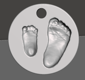 If you choose to provide your files print-ready, make sure that your format (15 or 18MM) is already set and the ring with an inner diameter of at least 2mm is attached to the charm. For the coin, the imprint must already be placed on the coin in the correct format, at the correct position, and optionally with a name. The hole should have a minimum diameter of 2MM, and the thickness of the coin must be at least 1.6. Try to enhance or deepen visible folds in the hands and feet so that they may still be visible on the small charm. This may look ‘exaggerated’ digitally on the model. Examples of a print-ready pregnancy charm and coin: